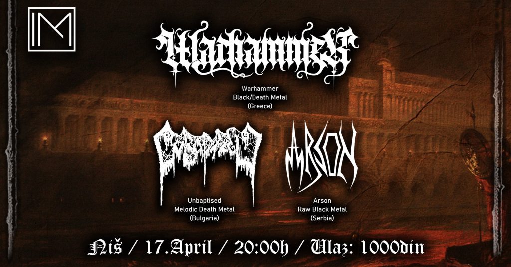 Niški klub Istina Mašina u petak 17. aprila postaće epicentar balkanskog andergraunda. U okviru evropske turneje „Death, Fire and Soil”, niška publika će imati priliku da čuje grčki Warhammer, bugarski Unbaptised i kruševački Arson. Ovaj tromeč donosi presek savremene black, death i doom metal scene regiona.